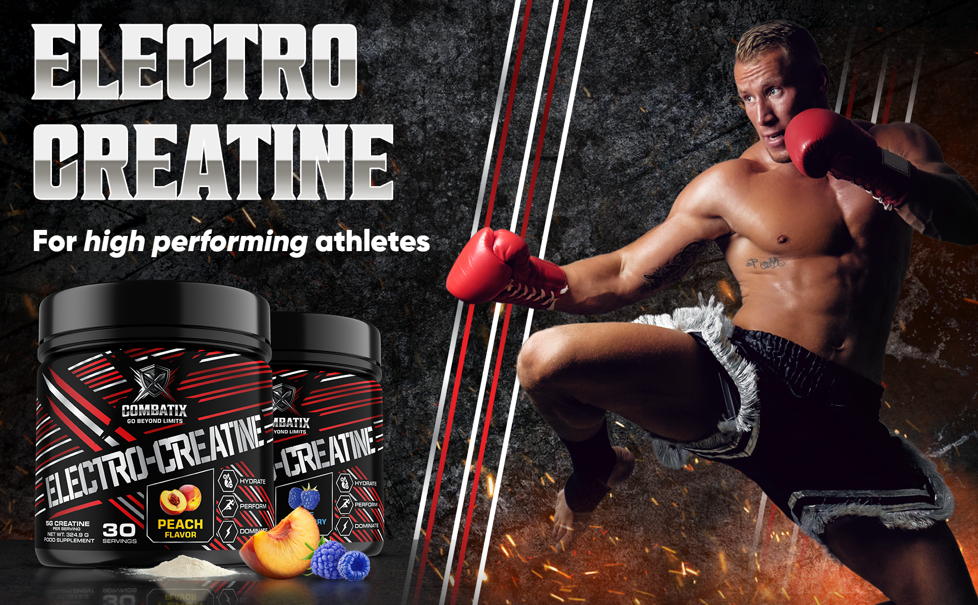 Combatix Electro-Creatine enhances ATP production, boosts muscle recovery, endurance, increases explosive power, and improves hydration for peak performance, trusted by performance and combat athletes.
